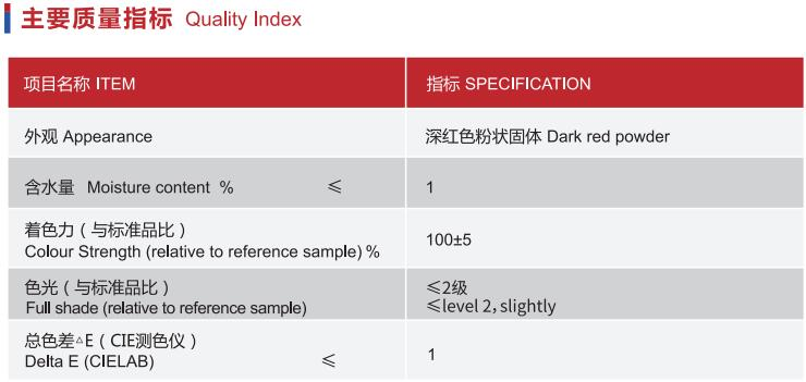产品为暗红色粉末,化学结构与C.I.还原红15相同,是颜料橙 43的顺式异构体。微溶于氯仿、氮杂苯、甲苯,不溶于丙酮和 乙醇。在浓硫酸中为红橙色。主要用于油漆、油墨、塑料制品 和聚酯原浆的着色,具有优异的耐光、耐候牢度和热稳定性。