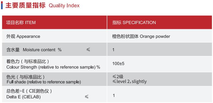 芘酮系高级有机颜料,艳红光橙色,色泽饱满,高着色力高,各 项牢度优异,耐光和耐气候达到6~7级,耐酸、耐碱、耐溶剂达 到5级,耐热稳定性可达到280℃。适用于汽车涂料、油墨及塑胶 制品以及纤维原液着色等。非常适用于室外产品着色有很好的颜 色耐久性,用于金属表面涂层有特殊的金属光泽。